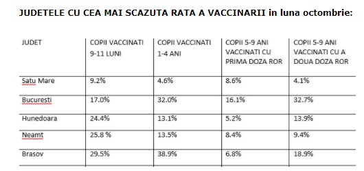 Cea mai dramatică situație este în județul Satu Mare, unde mai puțin de 10% dintre copii au fost vaccinați.