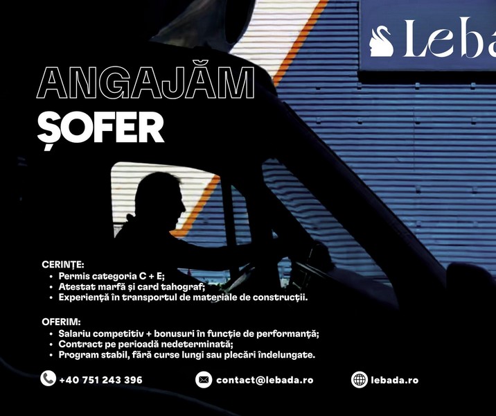 "Lebăda" caută un șofer profesionist, serios și responsabil, care să se alăture echipei. Compania activează în domeniul materialelor de construcții, iar transporturile sunt locale și regionale.