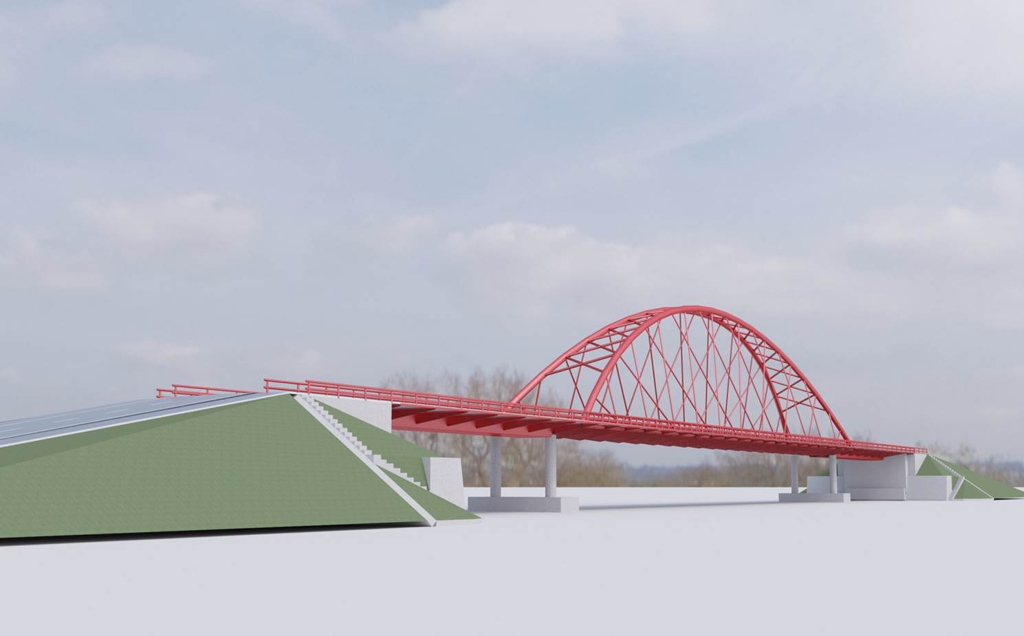 Tablierul este compus din trei deschideri. Una centrală de 101 metri, alcătuită din două arce metalice cu grindă tirant, solidarizate cu tiranți înclinați concurenți și două deschideri laterale, amplasate de o parte și de alta a deschiderii centrale de câte 35 de metri fiecare, realizate din grinzi simplu rezemate.