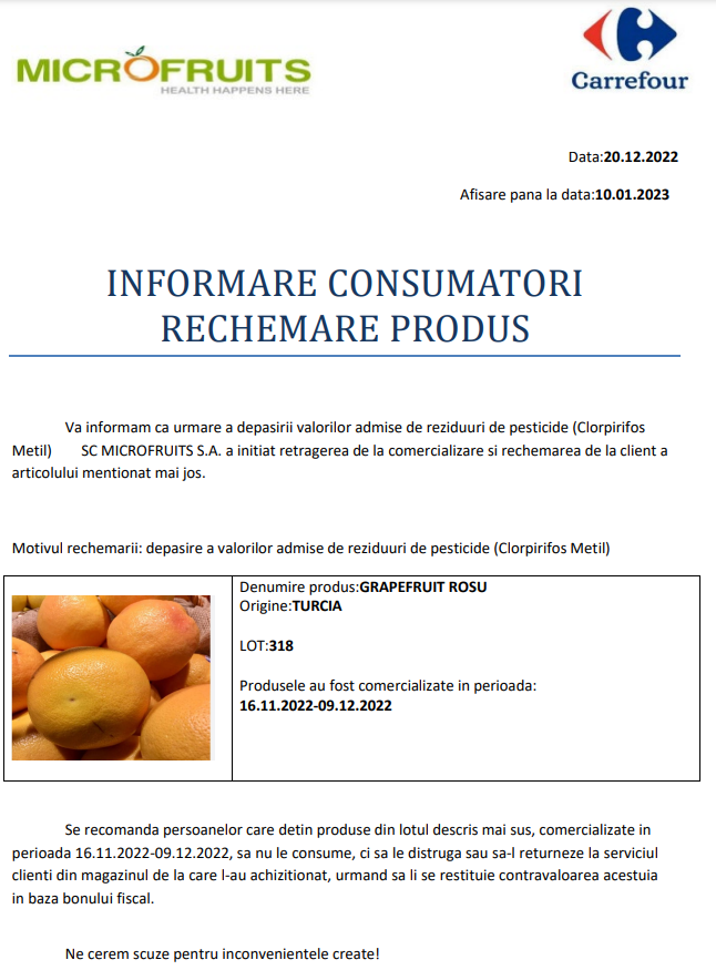 ”Vă informăm că am fost notificați de catre furnizorul MICROFRUITS SRL să inițiem retragerea de la comercializare și de la clienți a articolului menționat mai jos. Motivul rechemării: depășire a valorilor admise pentru reziduuri de pesticide (Chlorpyrifos-methyl),” tramsite A.N.S.V.S.A.