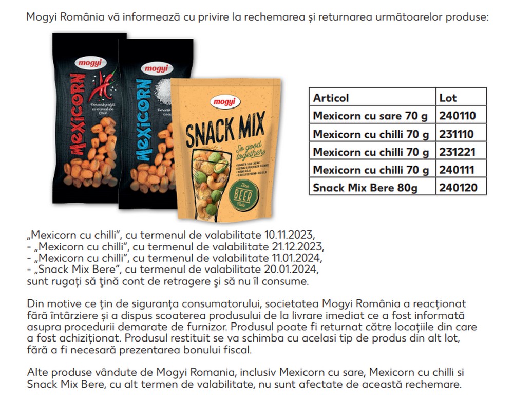 Clienţii care au cumpărat asfel de produse, în această perioadă, sunt rugați să nu le consume şi să le returneze sau să le distugă. Același produse dintr-un alt lot nu sunt afectate de această substanță.