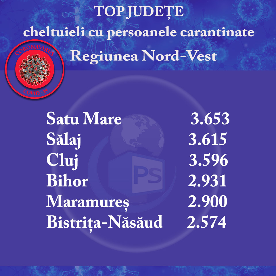 Practic, deși Satu Mare se află la jumătatea topului la nivel regional în ceea ce privește numărul de persoane plasate în carantină, conduce topul atunci când vine vorba de cheltuielile făcute. Județul Satu Mare este și singurul din nord-vestul țării care nu a cazat persoane obligate la carantină în spații gratuite. Lider este județul Bistrița-Năsăud, unde peste 200 de persoane au fost carantinate în spații gratuite. La nivel național, doar șapte județe, inclusiv Satu Mare, nu au cazat persoane în spații gratuite.