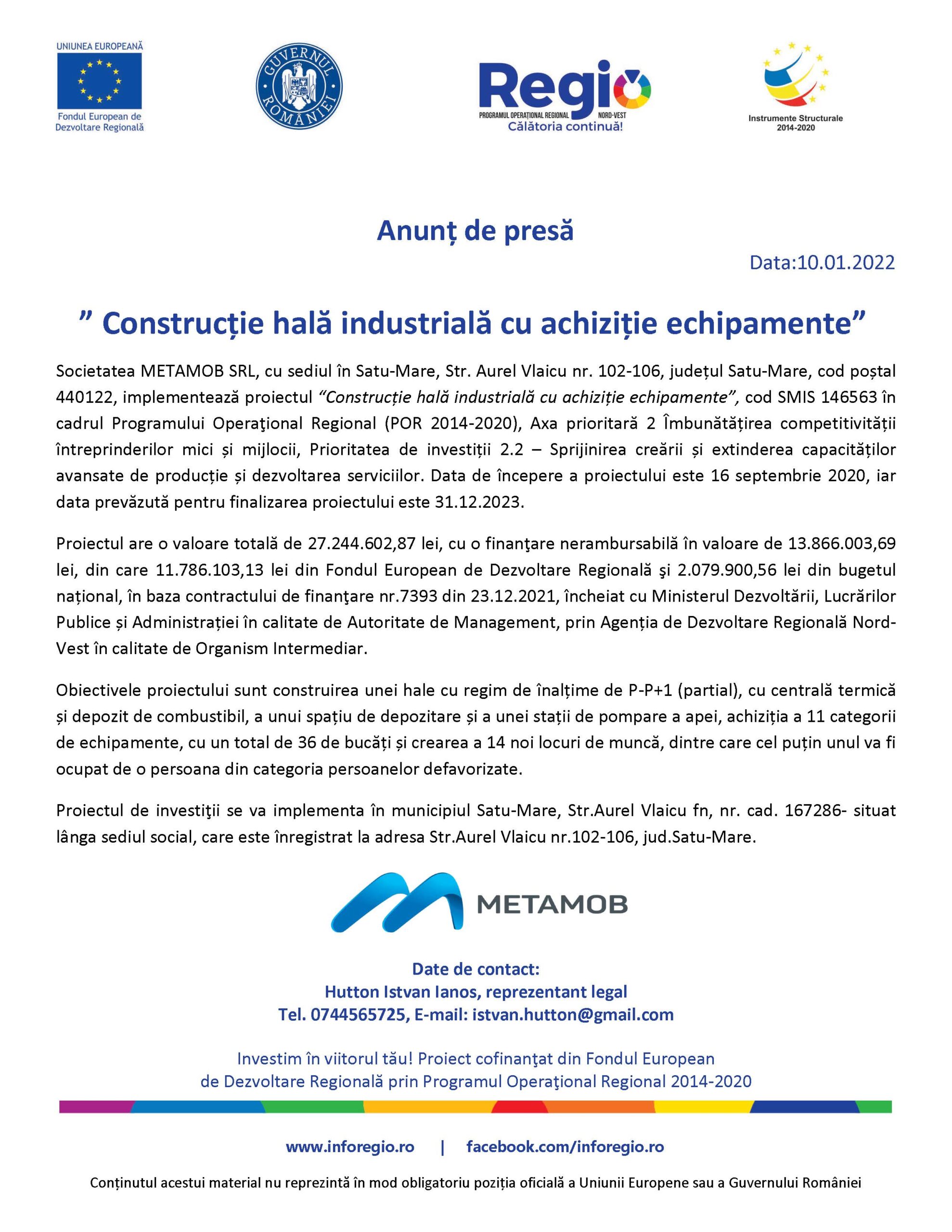 Anunț de presă: ”Construcție hală industrială cu achiziție echipamente ”