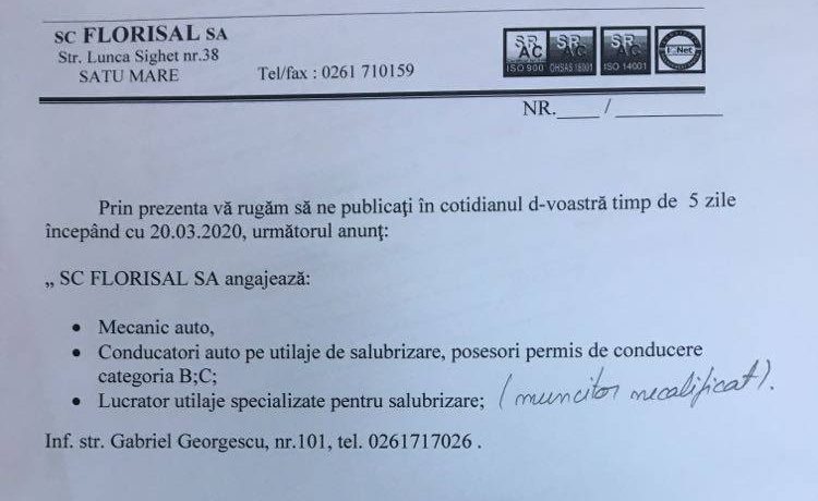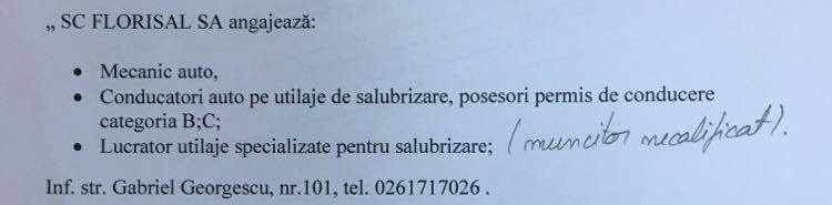”SC Florisal SA angajează: mecanic auto; conducători auto pe utilaje de salubrizare, posesori permis de conducere categoria B și C; lucrător utilaje specializate pentru salubrizare (muncitor necalificat)”, este anunțul Florisal.