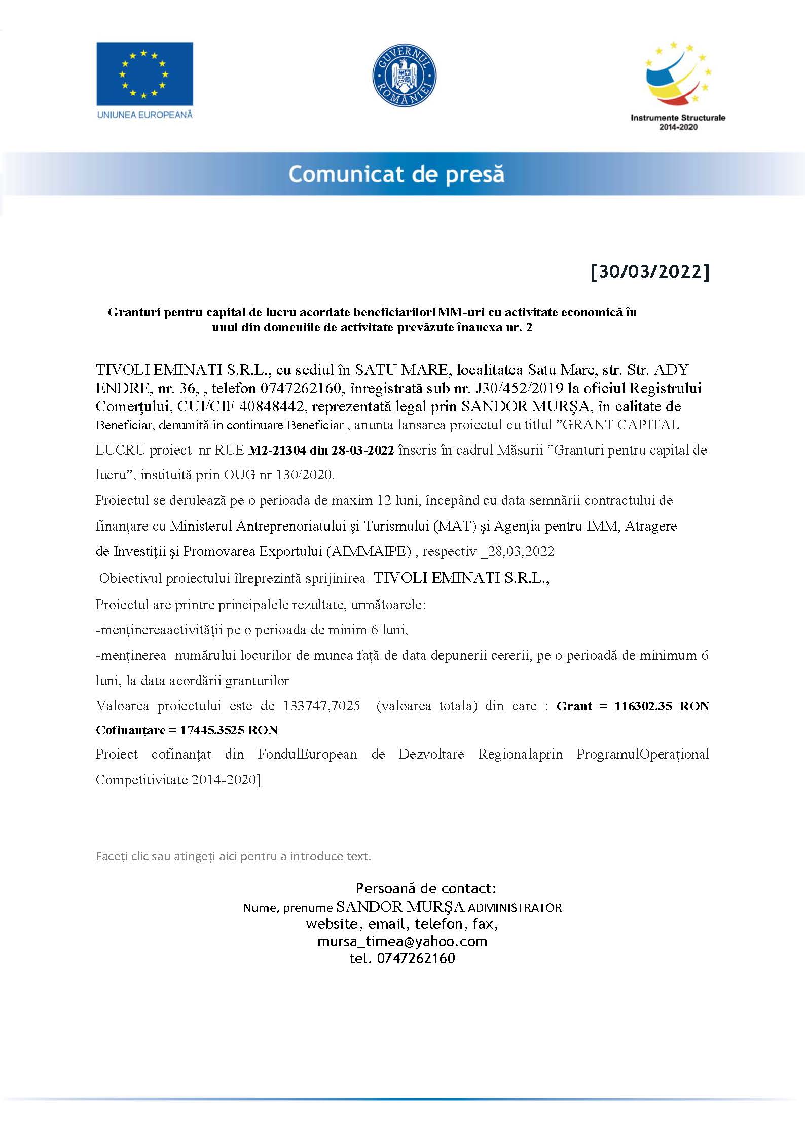 ANUNȚ. Granturi capital de lucru. Beneficiar: Tivoli Eminati SRL
