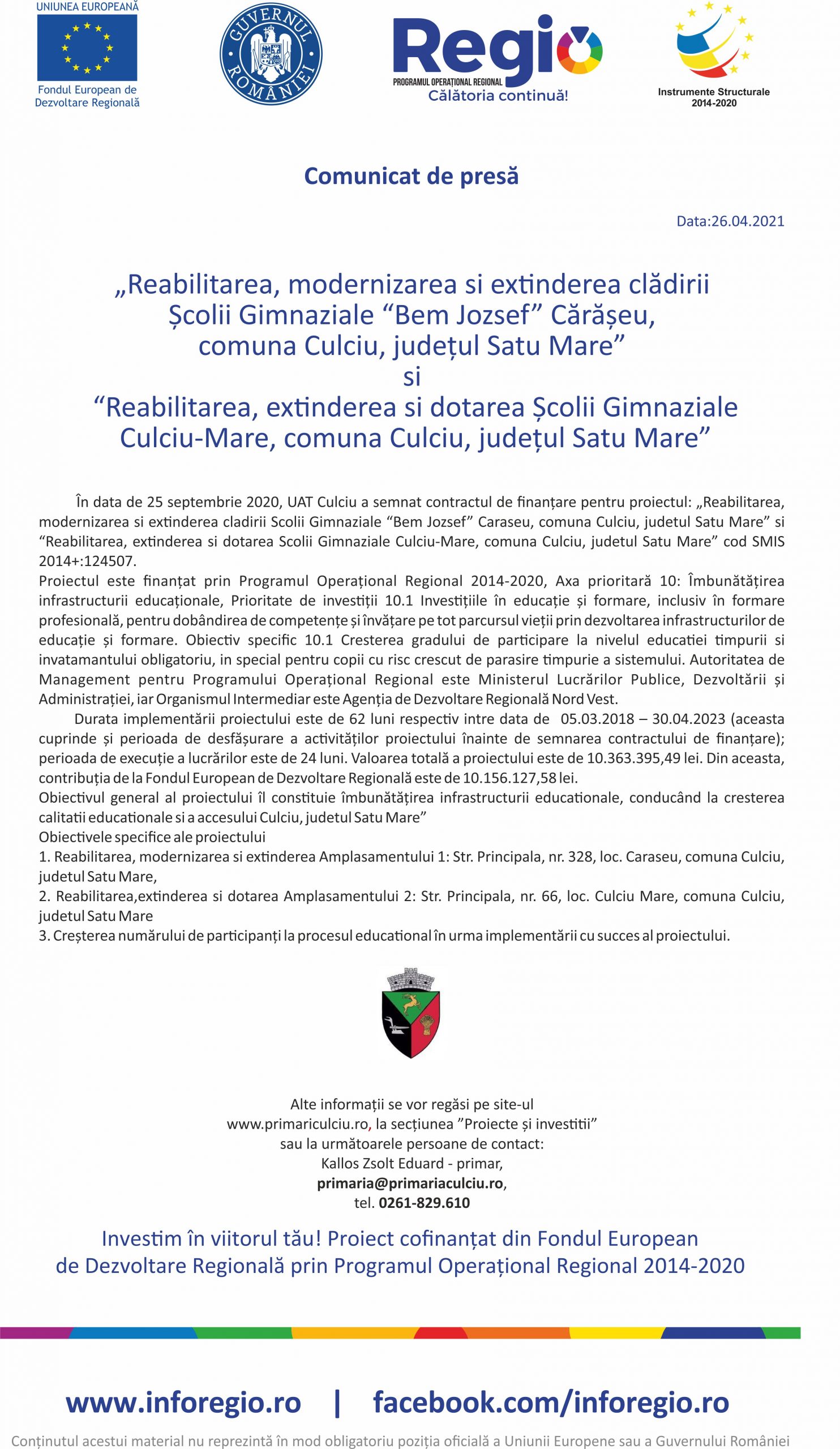 Anunț reabilitare Școala Gimnazială din Cărășeu și Școala Gimnazială Culciu Mare