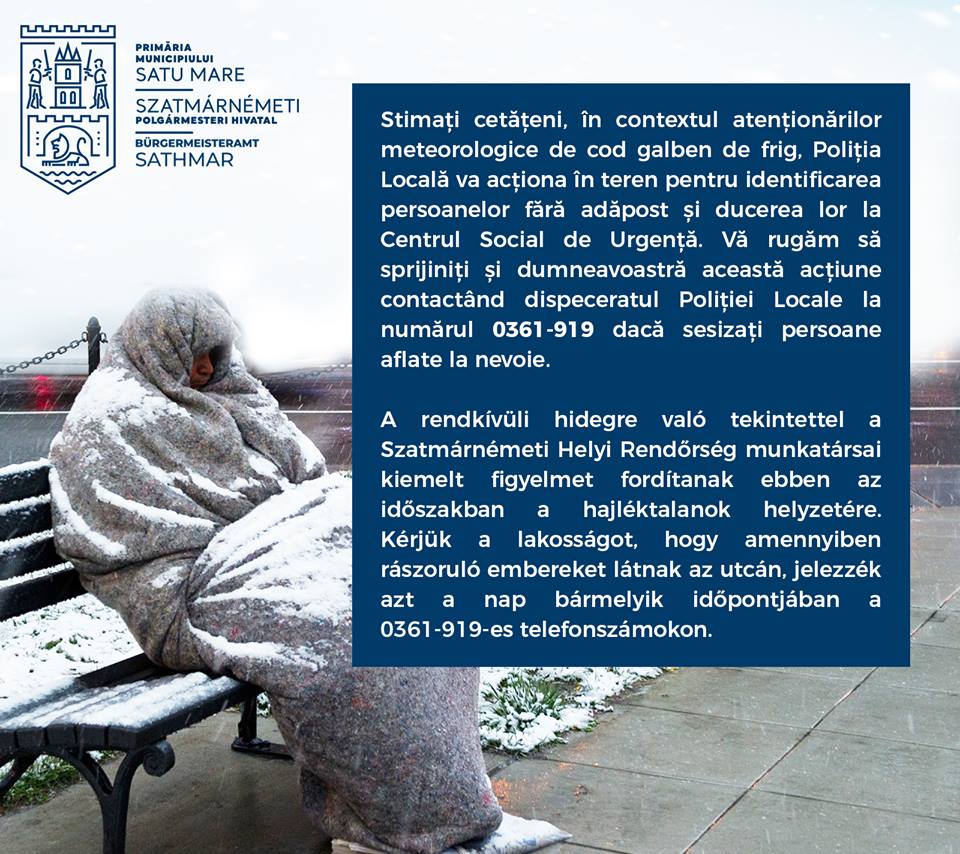 În contextul atenţionărilor meteorologice de cod galben de frig, Primăria Municipiului Satu Mare aduce la cunoștință publică faptul că în această perioadă echipejele Poliției Locale vor acționa în teren pentru identificarea persoanelor fără adăpost și aducerea acestora în Centrul Social de Urgență de pe strada Gladiolei, cartierul 14 Mai.