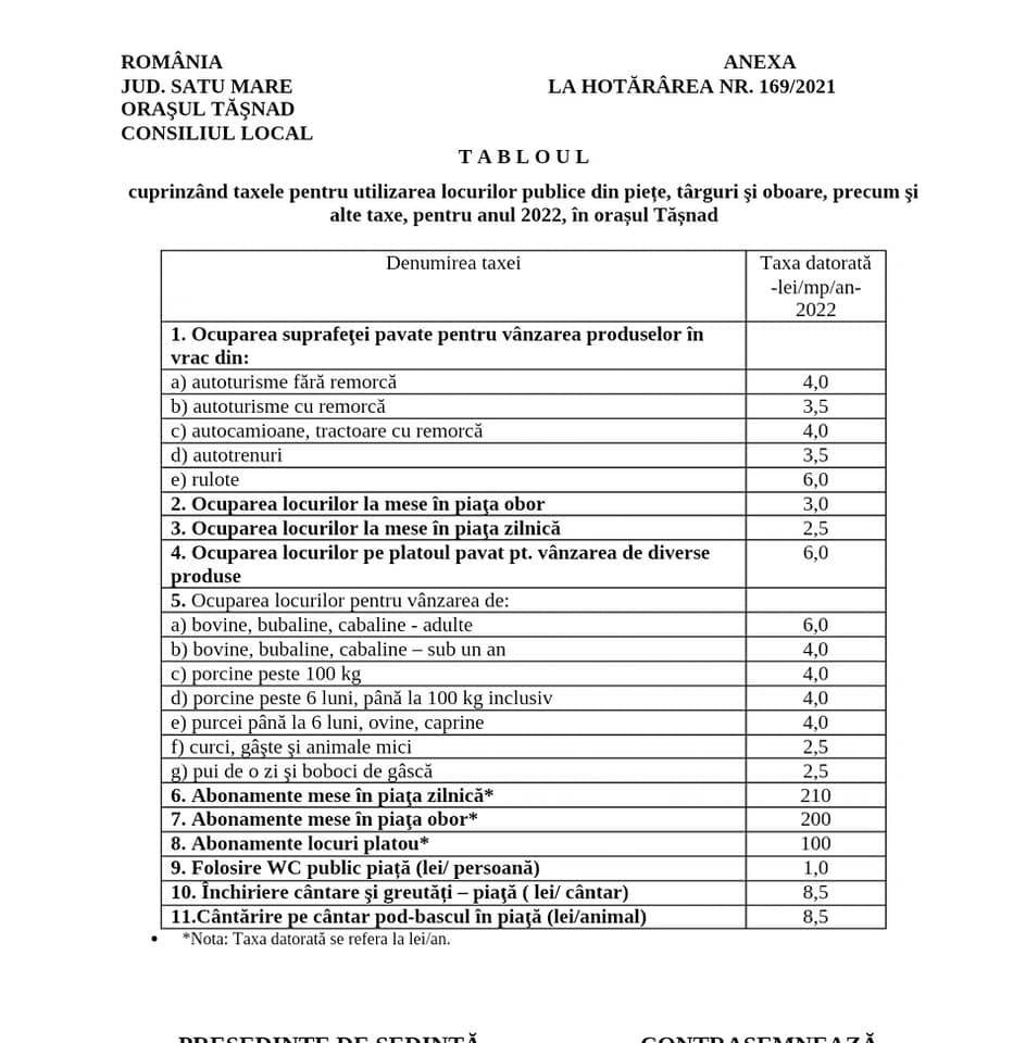 "Vă informam ca pentru anul 2022 taxele la piața Tășnad, în zona de legume, fructe, lactate, au fost reduse la jumătate din taxa veche. [...] Mulțumim Consiliului Local Tășnad, pentru ca au înțeles și sprijinit prin vot acest demers!", precizează într-o postare pe Facebook primarul localității Tășnad, Adrian Farcău.