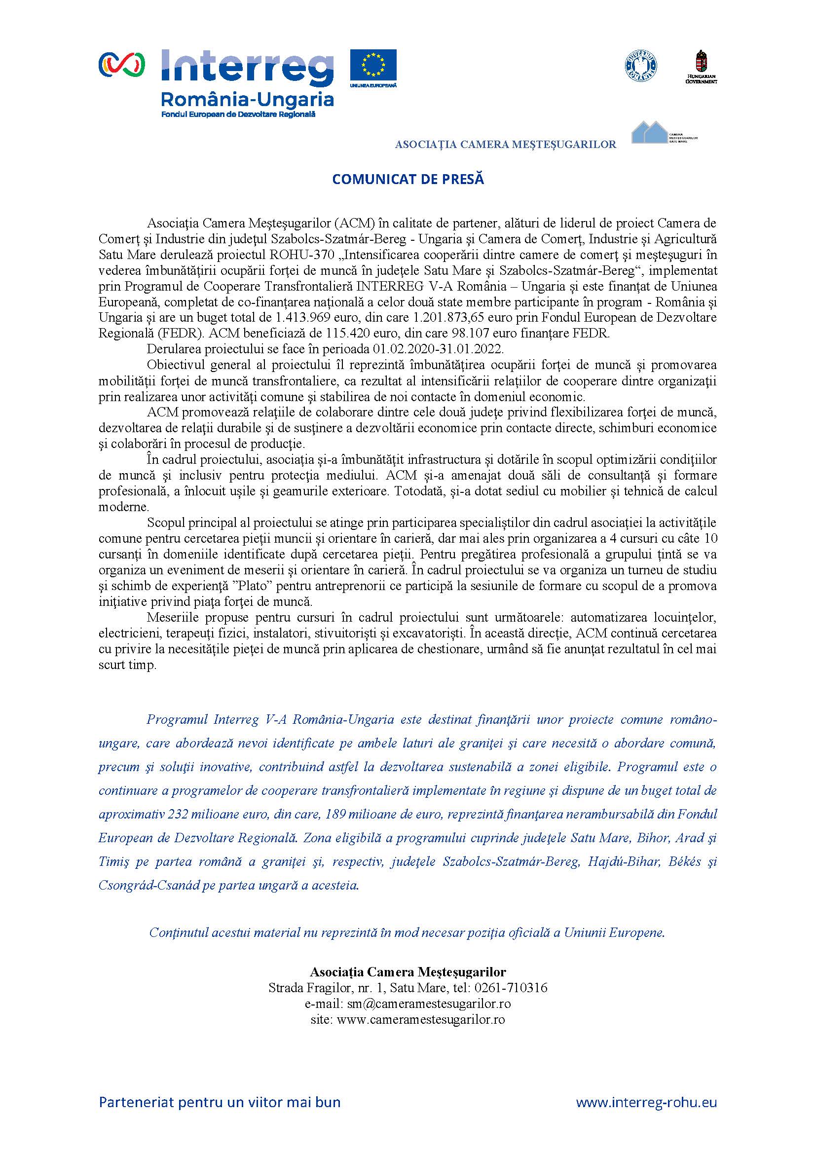 Asociaţia Camera Meşteşugarilor (ACM) în calitate de partener, alături de liderul de proiect Camera de Comerț și Industrie din judeţul Szabolcs-Szatmár-Bereg - Ungaria şi Camera de Comerț, Industrie și Agricultură Satu Mare derulează proiectul ROHU-370 „Intensificarea cooperării dintre camere de comerţ şi meşteşuguri în vederea îmbunătățirii ocupării forței de muncă în județele Satu Mare și Szabolcs-Szatmár-Bereg“, implementat prin Programul de Cooperare Transfrontalieră INTERREG V-A România – Ungaria și este finanțat de Uniunea Europeană, completat de co-finanțarea națională a celor două state membre participante în program - România și Ungaria și are un buget total de 1.413.969 euro, din care 1.201.873,65 euro prin Fondul European de Dezvoltare Regională (FEDR). ACM beneficiază de 115.420 euro, din care 98.107 euro finanțare FEDR.