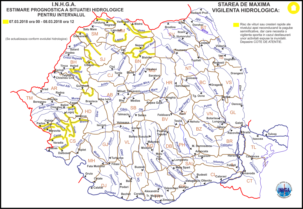 Institutul Național de Hidrologie și Gospodărire a Apelor a emis un cod galben de inundații pentru mai multe zone din județul Satu Mare în intervalul 07.03.2018 ora 00:00 – 08.03.2018, ora 12:00.