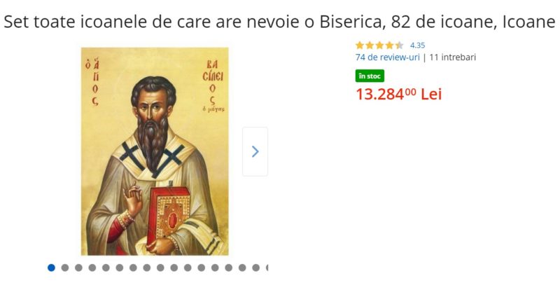Black Friday. Un producător a oferit, la reducere, un set de icoane, "de care are nevoie o Biserica, 82 de icoane, Icoane Individuale". Printre oferte se numără Duminica Învierii, Duminica Mironosițelor și Duminica După Nașterea Domnului. Oferta a revenit la normal, după noaptea marilor reduceri. Acum, icoanele sunt vândute la prețul la peste 13.000 lei.