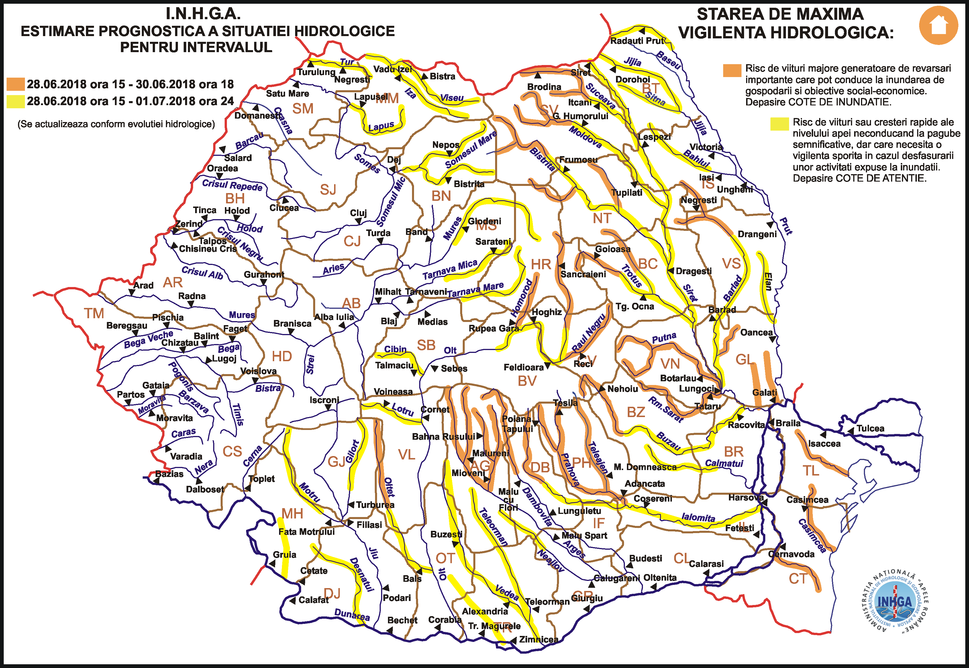 Data: 28.06.2018, ora 15:00 – 01.07.2018, ora 24:00, pe râurile din bazinele hidrografice: Vişeu, Iza, Tur, Lăpuş (judeţele Maramureş şi Satu Mare)