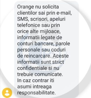 Clienți ai Orange România au primit în această dimineață mesaje prin care compania precizează că nu solicită, prin intermediul poștei electronice, prin SMS-uri, scrisori sau apeluri telefonice, date cu privire la conturile bancare, parolele personale sau codurile de reîncărcare ale clienților.