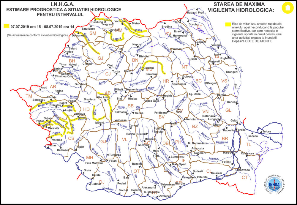 Vă prezentăm harta cu codurile. Se menționează că fenomenele hidrologice periculoase se pot produce mai ales pe afluenții de grad inferior ai râurilor marcate pe hartă.