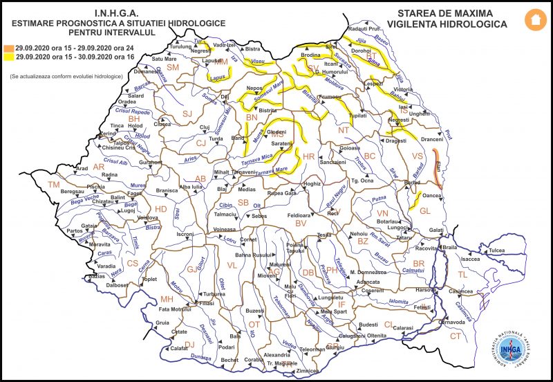 În intervalul 29.09.2020, ora 15:00 – 30.09.2020, ora 16:00, pe râurile din bazinele hidrografice: Iza – bazin superior şi afluenţi bazin mijlociu şi inferior (judeţul Maramureş), Tur – bazin superior şi afluenţi bazin mijlociu şi inferior (judeţul Satu Mare), Lăpuş – bazin superior şi afluenţi bazin mijlociu şi inferior (judeţul Maramureş).