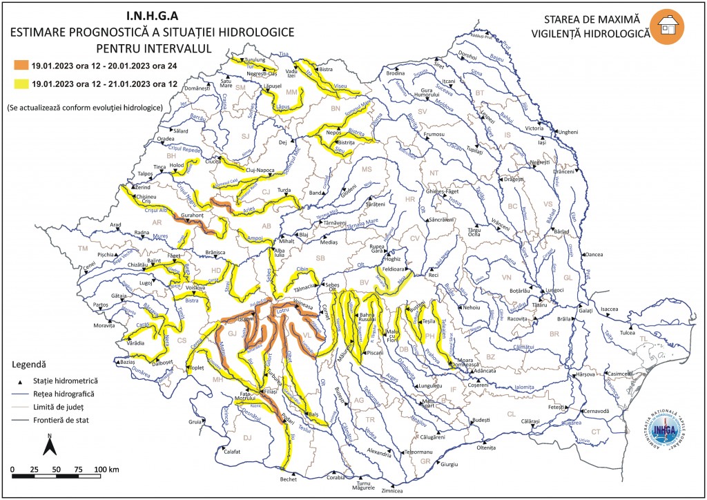 Fenomenele hidrologice periculoase se pot produce şi pe afluenții de grad inferior ai râurilor marcate pe hartă, mai precizează cei de la INHGA.