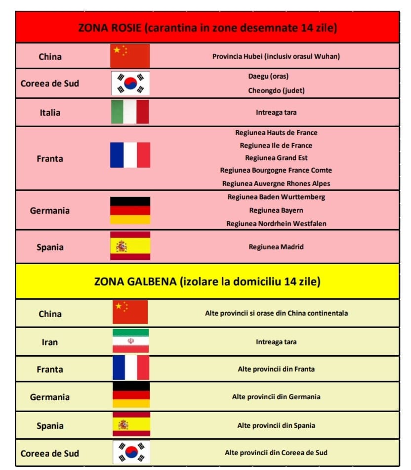 Precizarea vine după ce, pe site-ul ministerului Sănătății a apărut o listă actualizată cu zonele roșii și cele galbene, iar secretarul de stat Nelu Tătaru a precizat marți seara că pe lista de zone roșii, cele care obligă la carantină, vor fi incluse nordul Franței și Madridul.