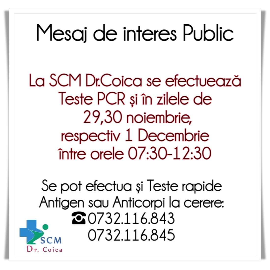 La Societatea Civilă Medicală Dr. Coica se efectuează teste Real Time - PCR și în zilele de 29, 30 noiembhrie, respectiv 1 decembrie, între orele 07.30 - 12.30. Se pot efectua și teste rapide antigen ...