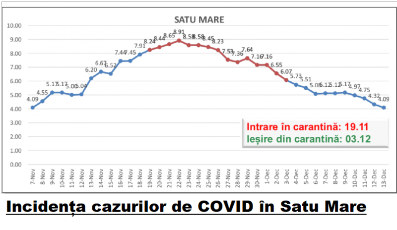 Potrivit Institutului Național de sănătate Publică, la data instituirii carantinei (19.11.2020), municipiul Satu Mare înregistra o incidență de 8,24 de cazuri la mia de locuitori, iar la data ieșirii ( 03.12.2020) valoarea a scăzut la 5,73 de cazuri la mia de locuitori.