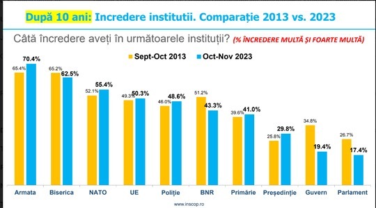 Clasamentul încrederii primelor patru instituţii este neschimbat din 2013 până în prezent, cu Armata şi Biserica pe primele două locuri, urmate de NATO şi Uniunea Europeană. Încrederea în Armată şi în NATO a crescut comparativ cu 2013, evoluţia fiind firească în contextul de securitate actual marcat de războiul din Ucraina.