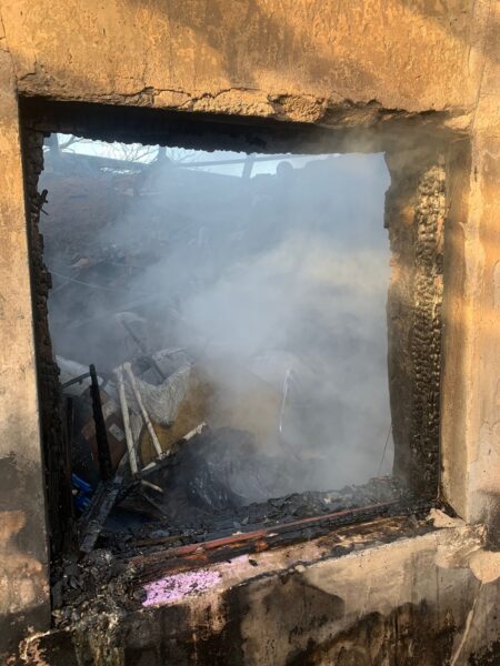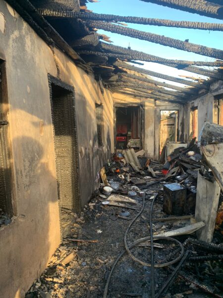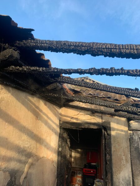 UDPATE 16:56 La sosirea pompierilor, incendiul se manifesta cu flacără deschisă în tot interiorul casei și la acoperișul acesteia.