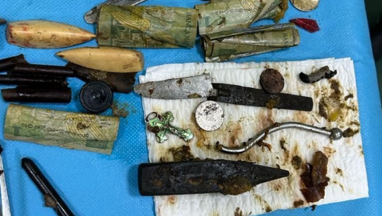 Operându-l i-au scos din stomac partea din metal a unui ciocan, o lamă de cuțit, piroane, bancnote de un leu rulate și o suită întreagă de obiecte din metal, din cauciuc și din plastic.