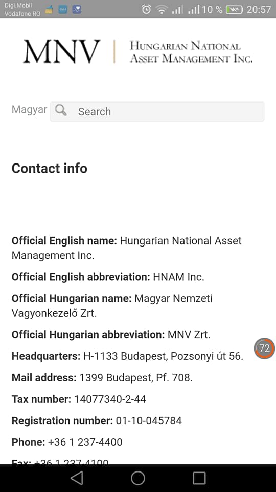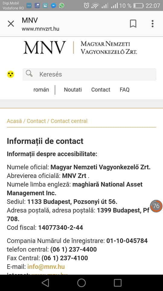 Căutând alte informatii despre această societate maghiară, aflu că la aceași adresă din Budapesta are sediul social și este dată persoana de contact tot un anume Peter Zavodszky, tocmai CONSILIUL NAȚIONAL PENTRU MANAGEMENTUL ACTIVELOR DIN UNGARIA și care se află sub controlul direct al Ministerului Dezvoltării al statului maghiar!!!