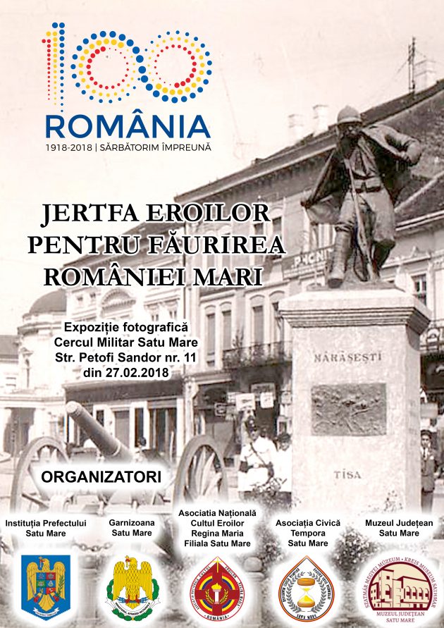 Instituţia Prefectului Judeţului Satu Mare, Garnizoana Satu Mare, Muzeul Judeţean Satu Mare, Asociaţia Naţională Cultul Eroilor “Regina Maria” – filiala Satu Mare şi Asociaţia Civică Tempora Satu Mare organizează în data de 27 februarie 2018, ora 14:00, la Cercul Militar al Garnizoanei Satu Mare, un eveniment deosebit dedicat Centenarului Marii Uniri. Este vorba despre vernisajul expoziţiei fotografice “Jertfa eroilor pentru făurirea României Mari”, în care vor fi prezentate imagini cu monumente ridicate pe raza judeţului Satu Mare în memoria eroilor din Primul Război Mondial.