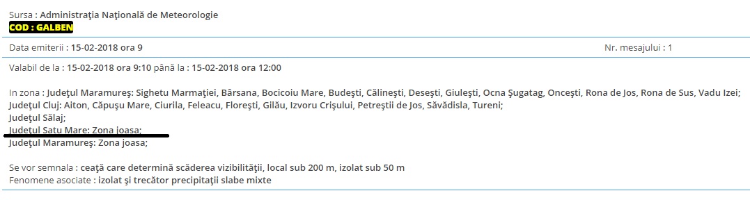 Administrația Națională de Meteorologie a remis în această dimineață, în intervalul orar 09.00 - 12.00, un cod galben de ceață. În județul Satu Mare sunt vizate zonele joase. ”Se vor semnala : ceaţă ...