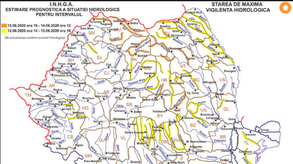 Până pe 14.06.2020, la ora 12:00 pe râurile din bazinele hidrografice: Tisa - sector aval intrarea ȋn ţară, Vişeu, Iza, Tur (judeţele Maramureş şi Satu Mare), Someşul Mare - bazin superior şi afluenţi bazin mijlociu şi inferior (judeţul Bistriţa Năsăud), Lăpuş – bazin superior şi afluenţi bazin mijlociu şi inferior (judeţul Maramureş), Olt - afluenţi aferenţi sectorului aval S.H. Sâncrăieni - amonte confluenţă cu râul Şercaia (judeţele Harghita, Covasna şi Braşov), Bistriţa - bazin superior şi afluenţi bazin mijlociu şi inferior (judeţele Suceava, Neamţ, Harghita şi Bacău), se vor afla sub Cod portocaliu.