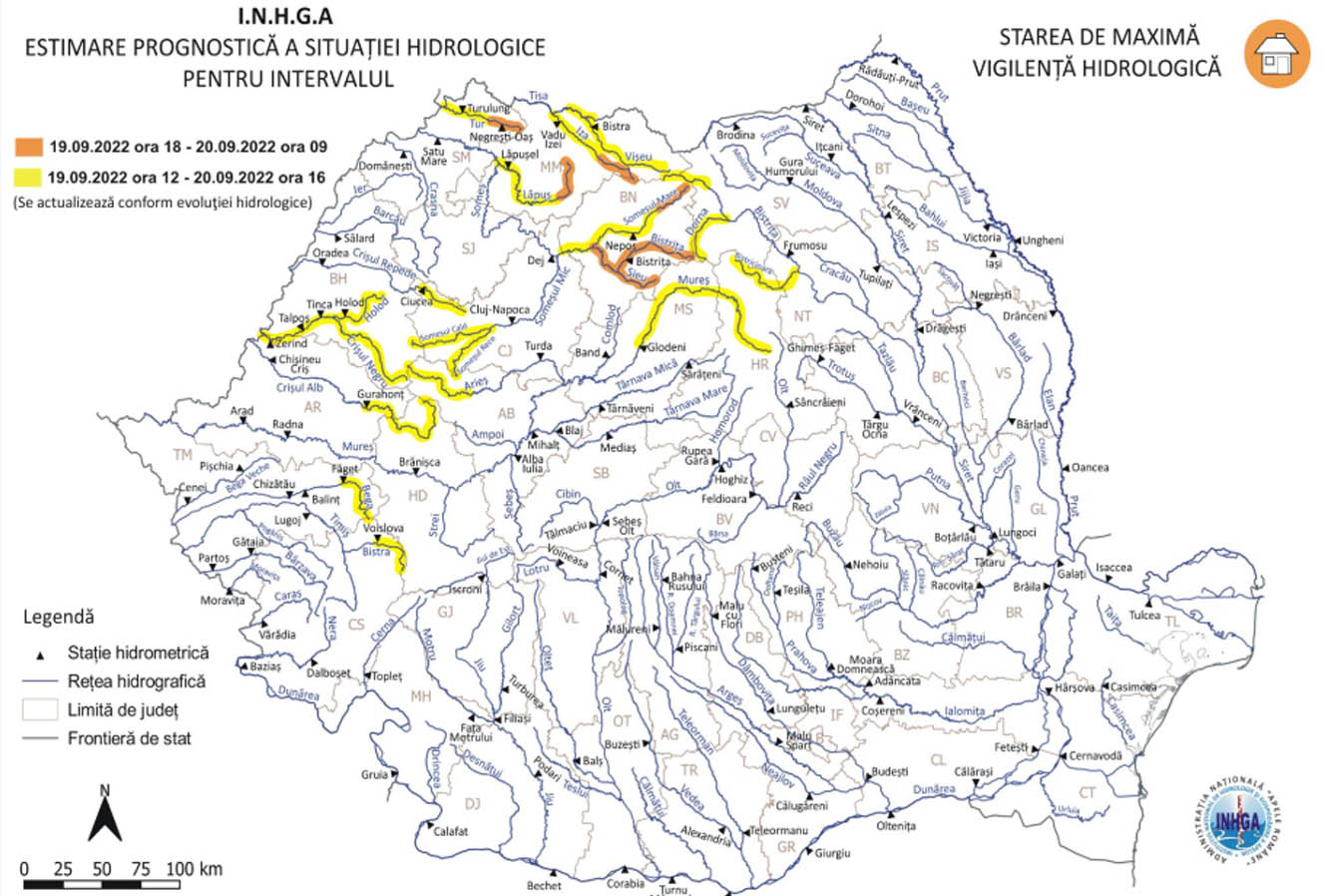 În intervalul 19.09.2022 ora 18:00 – 20.09.2022 ora 09:00 pe râul Tur, bazin superior şi afluenţi bazin mijlociu şi inferior (judeţul Satu Mare), va fi valabilă o avertizare Cod portocaliu cu risc de viituri majore generatoare de revărsări importante, care pot conduce la inundarea de gospodării şi obiective social – economice.