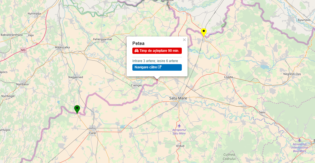 - Reamintim că pentru a veni în sprijinul participanților la trafic, Poliţia de Frontieră Română a dezvoltat o aplicaţie on-line, disponibilă pe pagina de internet www.politiadefrontiera.ro. Această aplicaţie on-line prezintă o medie a timpilor de aşteptare în punctele rutiere de trecere a frontierei pentru anumite intervale de timp, iar valorile afişate pot suferi modificări în funcţie de dinamica traficului în punctul de trecere respectiv, la un moment dat. Timpii de aşteptare sunt actualizaţi în timp real, fapt ce ajută utilizatorul să-şi reconfigureze traseul către un punct de frontieră ce înregistrează valori de trafic scăzute.