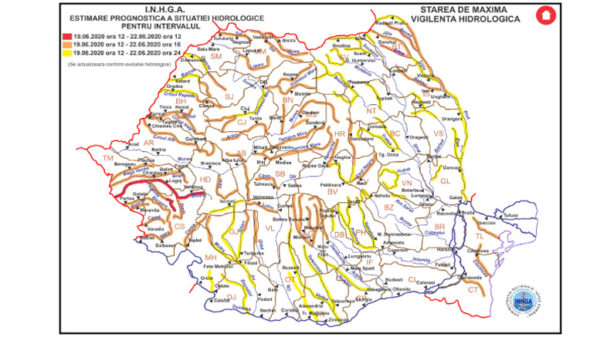 "Astfel, în intervalul 19.06.2020 ora 12:00 – 22.06.2020 ora 24:00 pe râurile din bazinele hidrografice: Tisa - sector aval intrarea ȋn ţară, Vişeu, Iza, Tur (judeţele: Maramureş şi Satu Mare), Someşul Mare (judeţul Bistriţa Năsăud), Lăpuş (judeţul Maramureş), Someşul Mic (judeţele: Cluj şi Bihor), Someş – afluenţii mici aferenţi sectorului aval S.H. Dej (judeţele: Cluj, Sălaj, Maramureş şi Satu Mare), Crasna (judeţele: Sălaj şi Satu Mare), Ier (judeţele: Satu Mare şi Bihor), Barcău (judeţele: Sălaj şi Bihor), vor fi sub Cod galben de inundații".