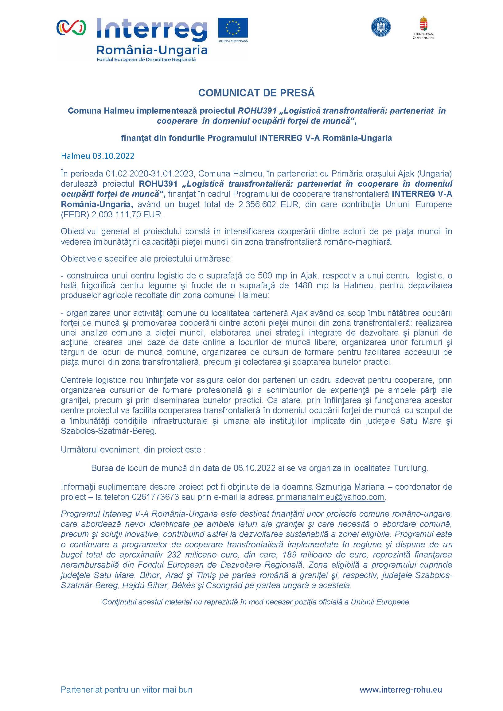 Comuna Halmeu implementează proiectul ROHU391 „Logistică transfrontalieră: parteneriat în cooperare în domeniul ocupării forței de muncă“