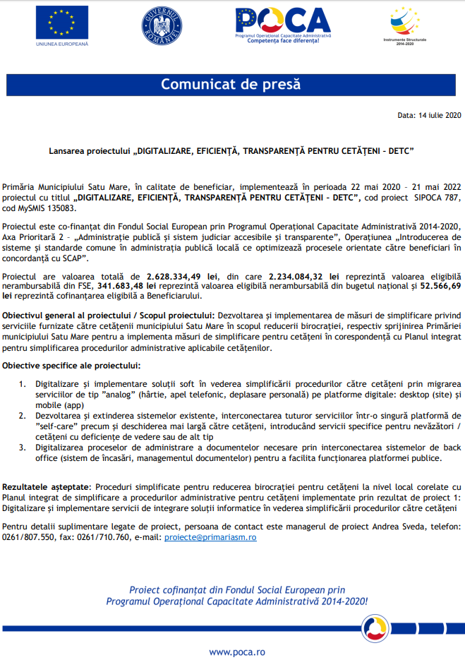 Comunicat de presă: Lansarea proiectului ”Digitalizare, eficiență, transparență pentru cetățeni - DETC”