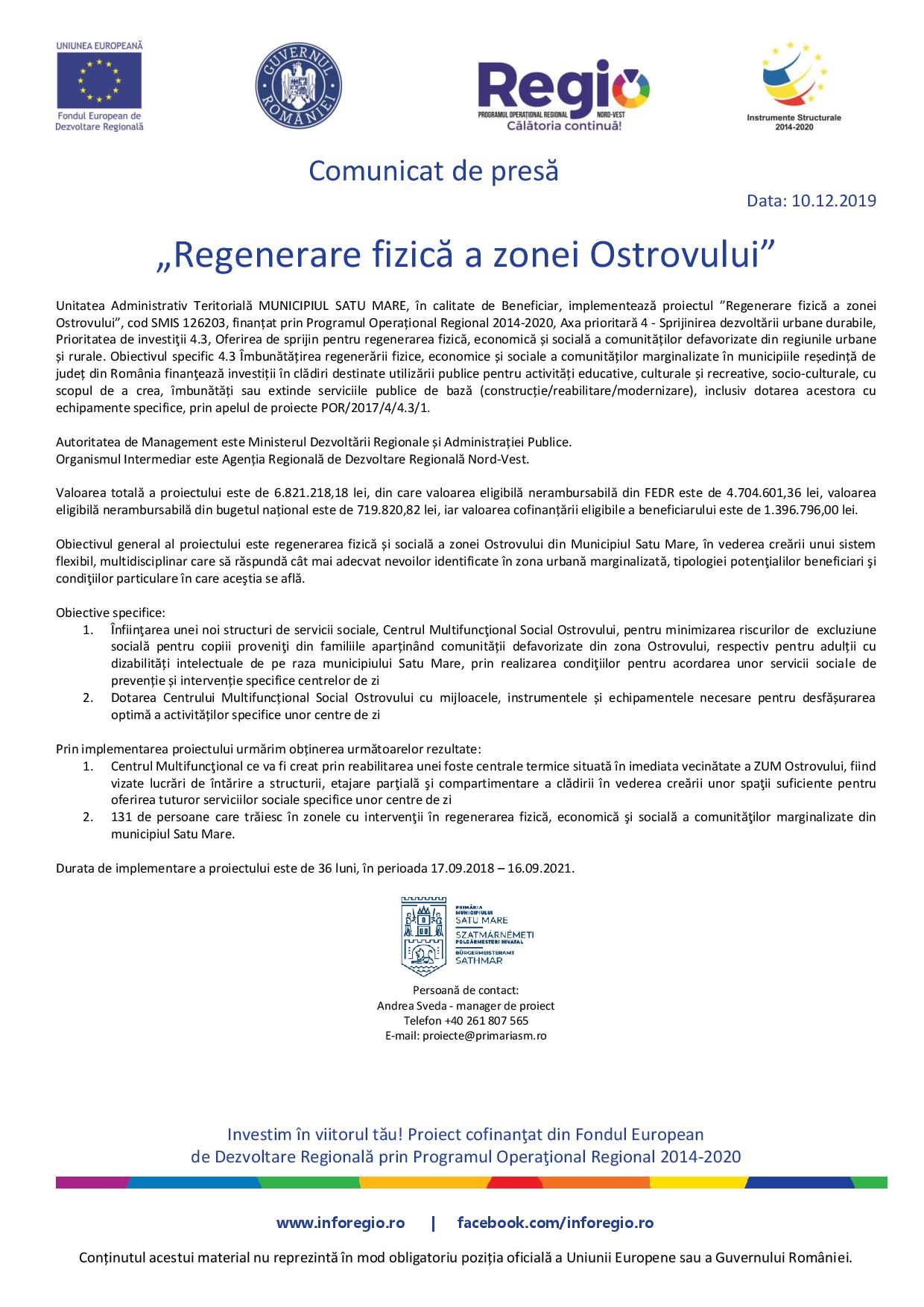 Comunicat de presă pentru proiectul "Regenerare fizică a zonei Ostrovului"