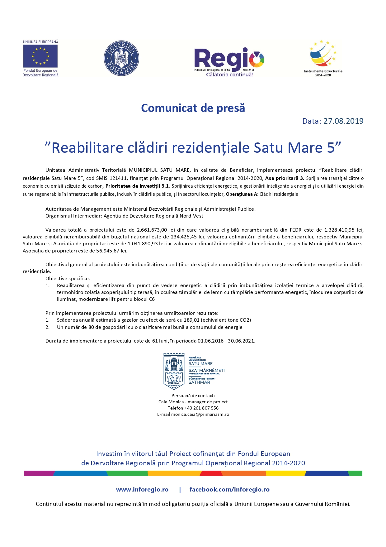 Comunicat de presă: ”Reabilitare clădiri rezidențiale Satu Mare 5”