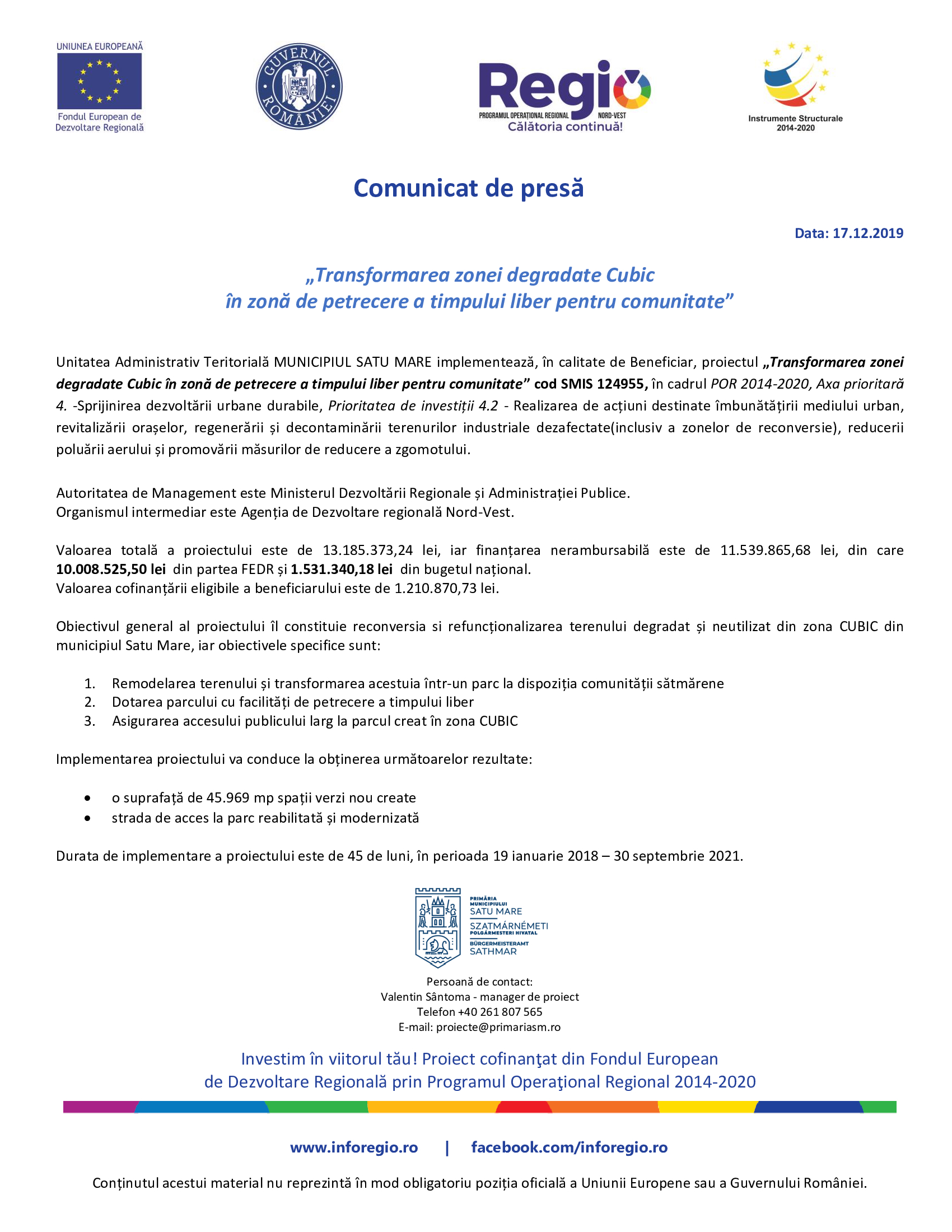 Comunicat de presă „Transformarea zonei degradate Cubic în zonă de petrecere a timpului liber pentru comunitate”