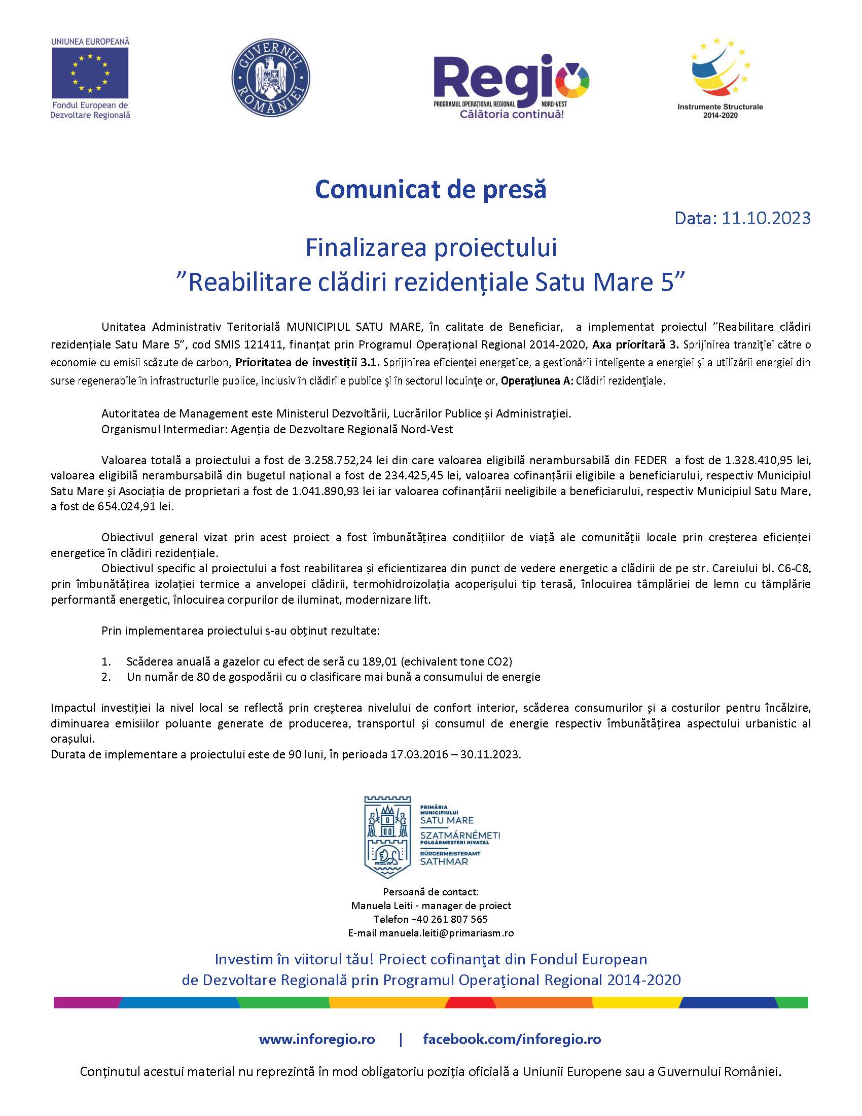 COMUNICAT. Finalizarea proiectului ”Reabilitare clădiri rezidențiale Satu Mare 5”