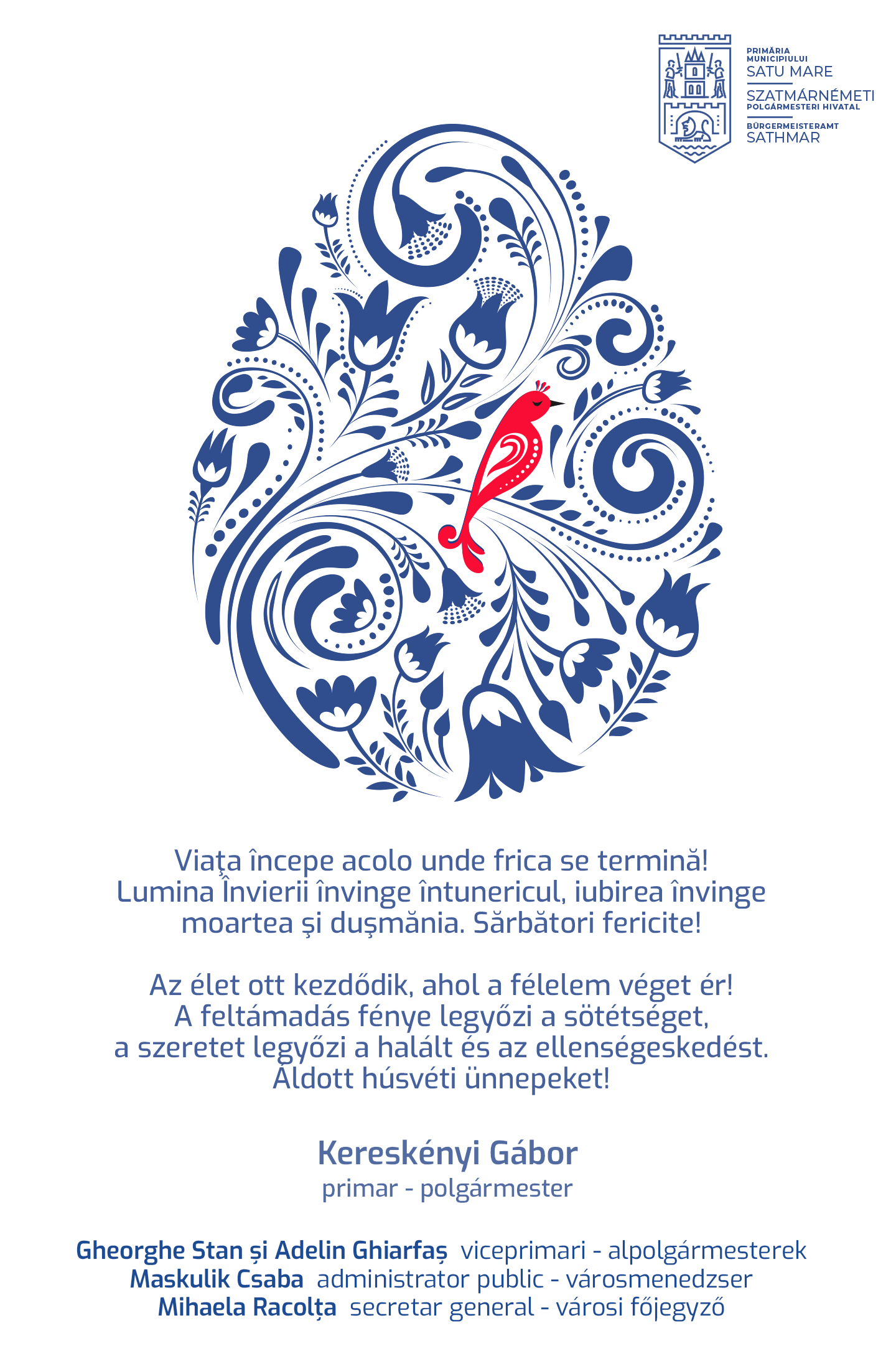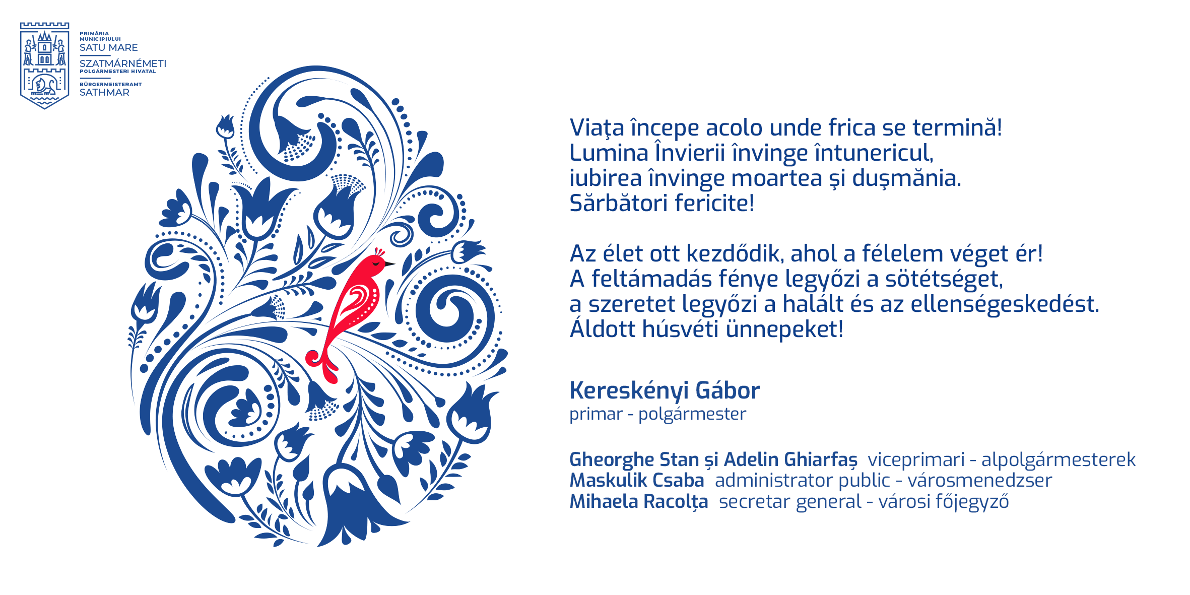 Conducerea Primăriei Satu Mare, prin primarul Kereskenyi Gabor, viceprimarii Gheorghe Stan și Adelin Ghiarfaș, alături de administratorul public Maskulik Csaba, le urează gânduri bune tuturor sătmărenilor care sărbătoresc Sfintele Paște.