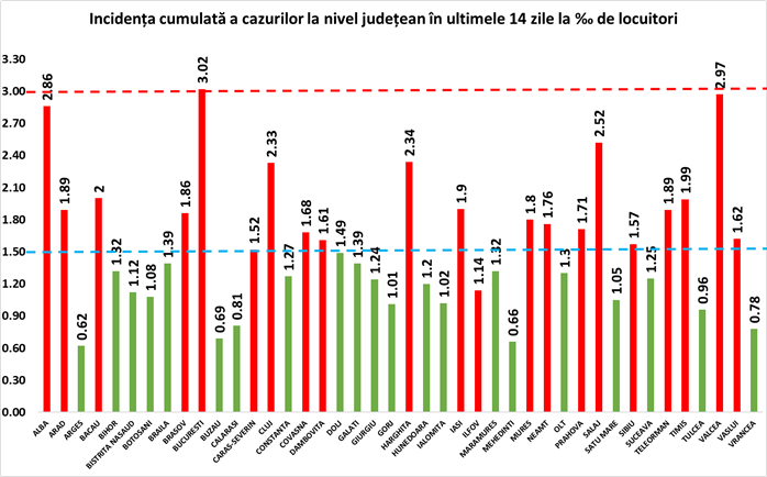 Coeficientul infectărilor cumulate la 14 zile, raportate la 1.000 de locuitori, calculat de către Direcțiile de Sănătate Publică, la nivelul Municipiului București și al județelor este următorul: