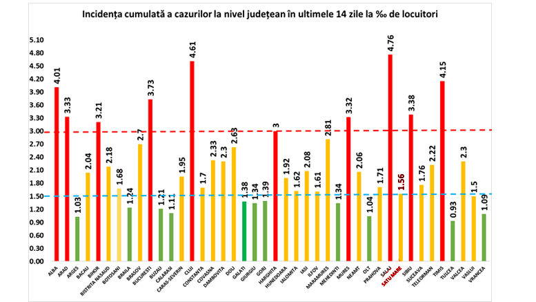 Astăzi, și județul Satu Mare a depășit pragul de 1,5, întreg județul fiind în scenariul galben, asta în timp ce ieri, autoritățile avertizau că municipiul reședință de județ se apropie de pragul de 3 cazuri la mia de locuitori.