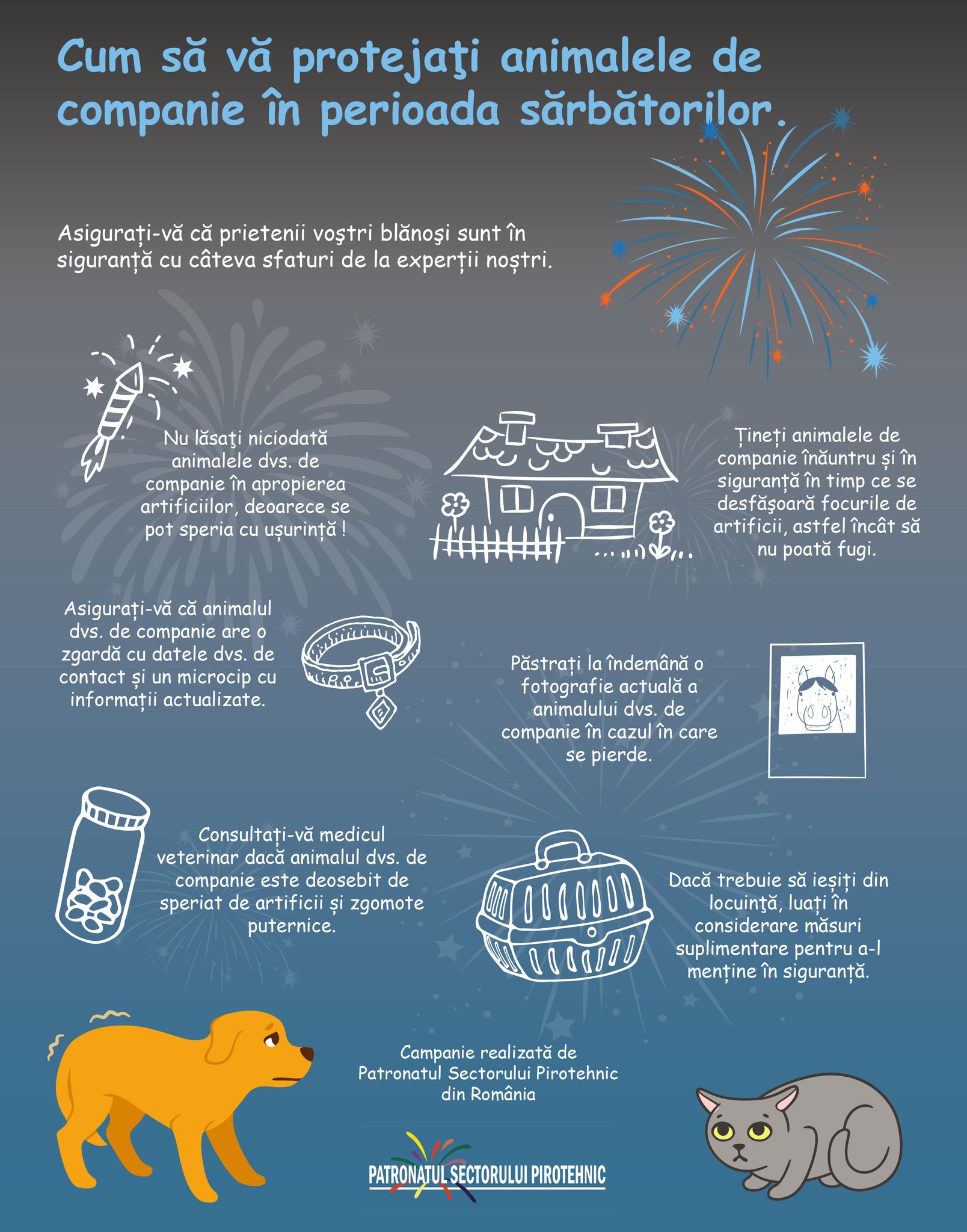 De aceea, în campania lansată de Patronatul Sectorului Pirotehnic (P.S.P.) oferă tuturor celor care dețin animale de companie câteva sfaturi și avertismente bune pentru cum să vă protejați animalele de companie în noaptea de Revelion.