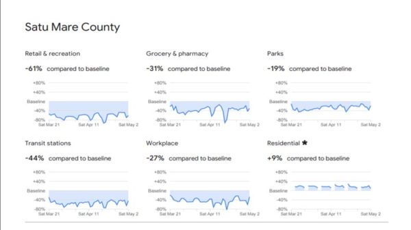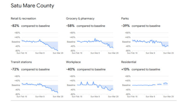 Ultimele date prezentate de Google arată că sătmărenii au început încet, încet să iasă din izolare. Scăderile înregistrate în mobilitate sunt mult mai puțin importante decât cele din luna martie, semn că unele activități de producție au fost reluate, iar sătmărenii au început să iasă din case.