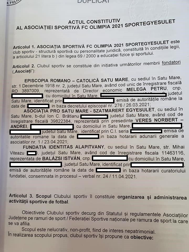 Mai exact, unul dintre primii pași a fost înființarea ”Asociației Sportive FC Olimpia 2021 Sportegyesulet”. Potrivit actului constitutiv al asociației sportive, există trei membri fondatori: Episcopia Romano-Catolică Satu Mare, reprezentată de directorul economic Petru Melega, Asociația Pro Satu Mare – Szatmarert Egyesulet, reprezentată de președintele Andrei Norbert Vereș, respectiv Fundația Identitas Alapitvany, reprezentată de Istvan Balazs.