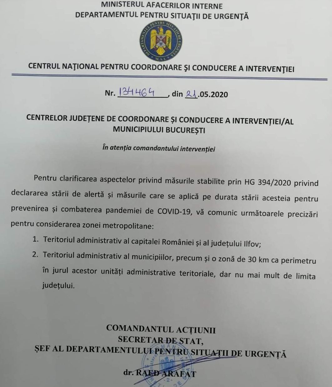 ”Pentru clarificarea aspectelor privind măsurile stabilite prin HG 394/2020 privind declararea stării de alertă şi măsurile care se aplică pe durata stării acesteia pentru prevenirea şi combaterea pandemiei de COVID-19, vă comunic următoarele precizări pentru considerarea zonei metropolitane: (...) Teritoriul administrativ al municipiilor, precum şi o zonă de 30 km ca perimetru în jurul acestor unităţi administrative teritoriale, dar nu mai mult de limita judeţului”, se arată în documentul citat.