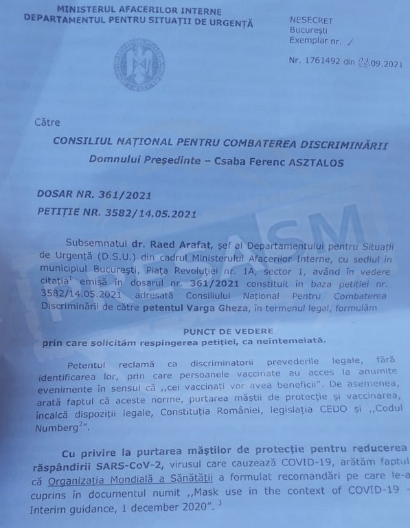 Sătmăreanul Gheza Varga l-a reclamat pe șeful Departamentului pentru Situații de Urgență, dr. Raed Arafat, la Consiliul Național pentru Combaterea Discriminării, acuzând faptul că persoanele nevaccinate ar fi discriminate prin interzicerea accesului în spațiile publice închise, acolo unde rata mare de incidență impune aceste restricții, conform unui document obținut de PresaSM.