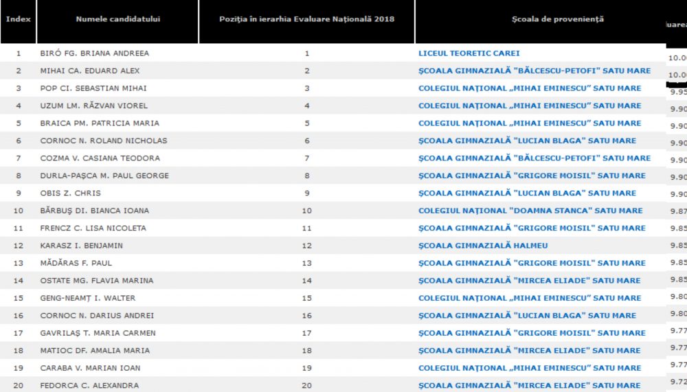Ministerul Educației a afișat rezultatele la Evaluarea Națională. Doi elevi au luat nota zece după realizarea mediilor. Este vorba despre Briana Andreea Biro, de la Liceul Teoretic Carei și Eduard Alex Mihai, de la Școala Gimnazială „Bălcescu-Petofi”.