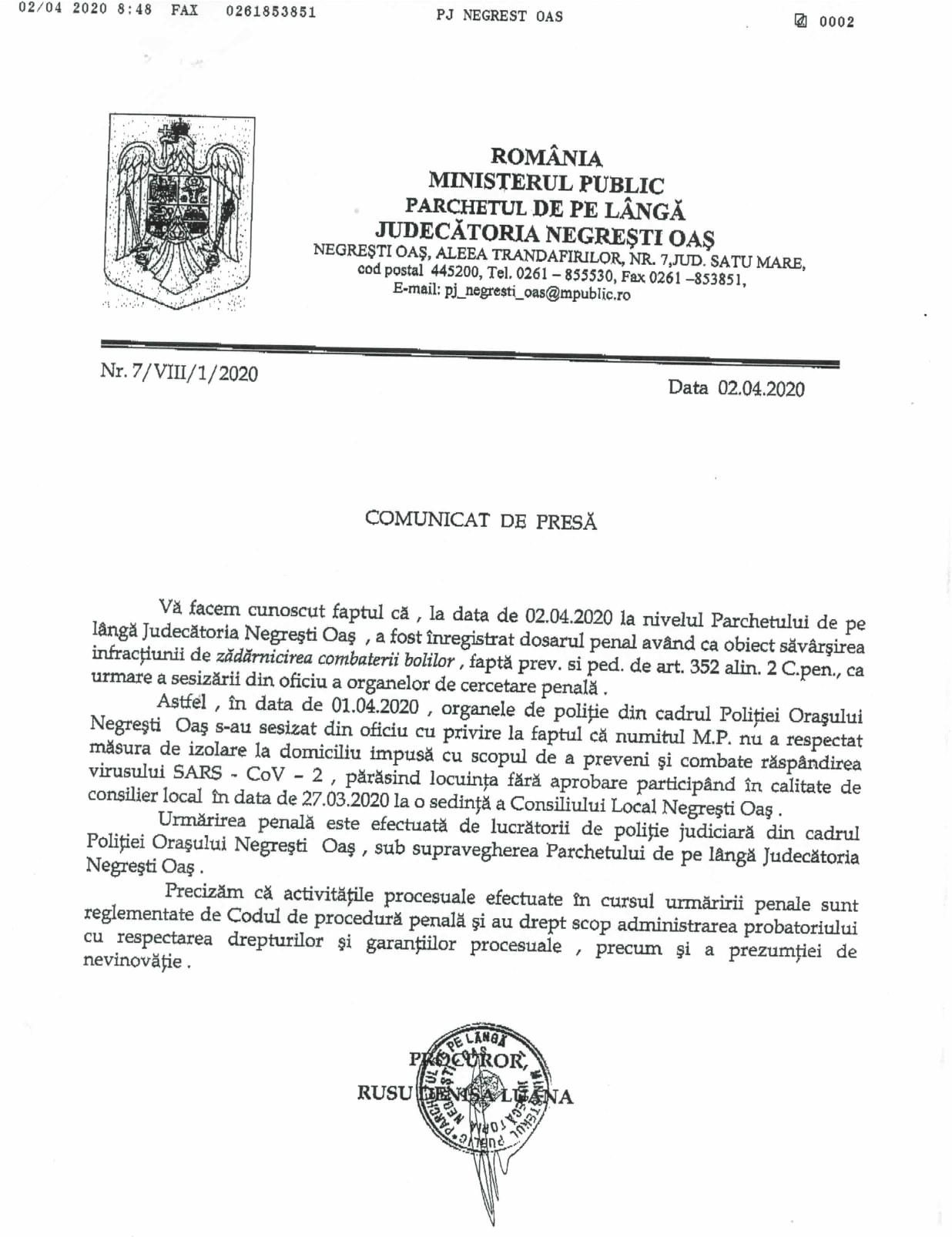 Comunicat de presă al Parchetului de pe lângă Judecătoria Negrești-Oaș - Constituire dosar - zădărnicirea combaterii bolilor: ”Vă facem cunoscut faptul că, la data de 02.04.2020, la nivelul Parchetului de pe lângă Judecătoria Negrești-Oaș, a fost înregistrat dosarul penal având ca obiect săvârșirea infracțiunii de zădărnicirea combaterii bolilor, faptă prev. si ped. de art. 352 alin. 2 C.pen., ca urmare a sesizării din oficiu a organelor de cercetare penală. Astfel, în data de 01.04.2020, organele de poliție din cadrul Poliției Orașului Negrești-Oaș s-au sesizat din oficiu cu privire la faptul că o persoană nu a respectat măsura de izolare la domiciliu impusă cu scopul de a preveni și combate răspândirea virusului SARS-CoV-2, părăsind locuința fără aprobare, participând în calitate de consilier local în data de 27.03.2020 la o ședință a Consiliului Local Negrești-Oaș. Urmărirea penală este efectuată de lucrătorii de poliție judiciară din cadrul Poliției Orașului Negrești-Oaș , sub supravegherea Parchetului de pe lângă Judecătoria Negrești-Oaș. Precizăm că activitățile procesuale efectuate în cursul urmăririi penale sunt reglementate de Codul de procedură penală și au drept scop administrarea probatoriului cu respectarea drepturilor și garanțiilor procesuale, precum și a prezumției de nevinovăție.