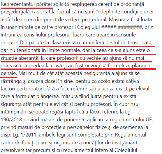 Faptul că unii profesori au depus plângeri penale împotriva unor elevi este tocmai afirmația conducerii Colegiului Național ”Mihai Eminescu” Satu Mare (pe care în prezent o neagă) în cauza aflată pe rolul Tribunalului Satu Mare.